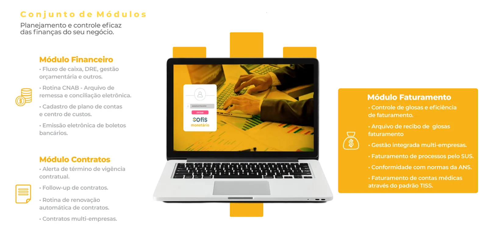 Com o Monetário você obtém o controle eficiente, preciso e seguro de todos os eventos e recursos do seu negócio, desde o processo de faturamento, pagamento e recebimento até a gestão do fluxo do caixa.